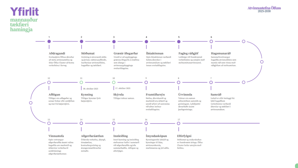 Sveitarfélagið Ölfus vinnur nú að mótun nýrrar atvinnustefnu til næstu ára í samstarfi við Ölfus Cluster. Markmiðið er að efla fjölbreytt atvinnulíf, styðja við núverandi fyrirtæki og skapa ný tækifæri til framtíðar. Íbúar, fyrirtæki og hagaðilar taka virkan þátt í ferlinu og verða niðurstöður nýrrar stefnu kynntar síðar á árinu 2025.